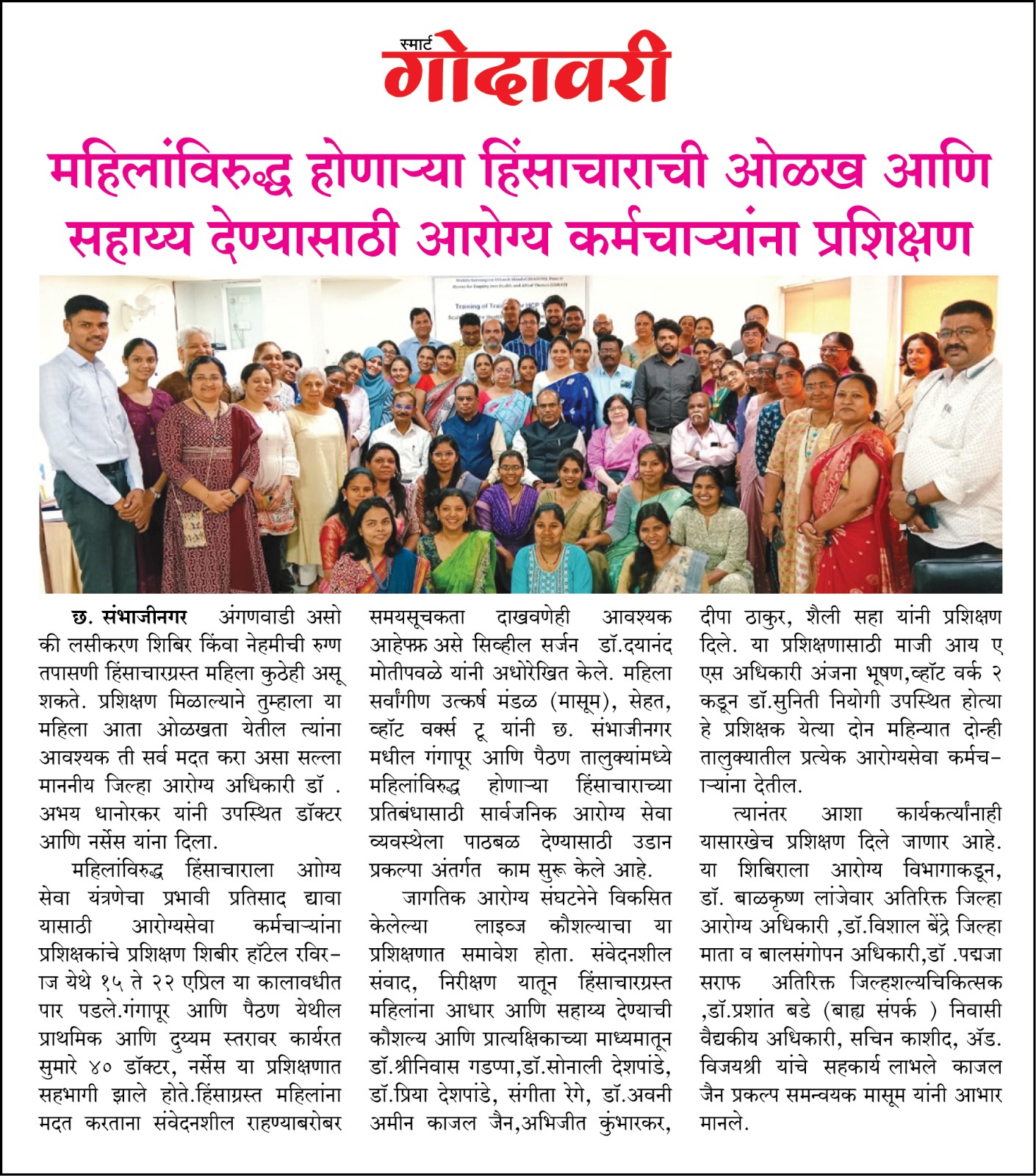 महिलांविरुद्ध होणार्या हिंसाचाराची ओळख आणि सहाय्य देण्यासाठी आरोग्य कर्मचार्यांना प्रशिक्षण - गोदावरी स्मार्ट - २५ एप्रिल २०२५ हिंसाचार ओळखण्यासाठी कर्मचार्यांना प्रशिक्षण - सकाळ - २४ एप्रिल २०२५ वंचित गटाने नेतृत्व करावे - लोकसत्ता – ८ मार्च २०२५ मासूम आणि सेहत संस्थेतर्फे छत्रपती संभाजीनगरात कार्यशाळा - सामना – १० जुलै २०२४ कार्यशाळा - महिलांवरील हिंसा आणि आरोग्य सेवांचा प्रतिसाद : महिला सुरक्षा हा विकासाचा महत्वाचा पैलू - संजयवार्ता – १० जुलै २०२४ डॉ. कोल्हे दाम्पत्य मासूमला 'यशोदा माई राष्ट्रीय पुरस्कार' –१० नोव्हेंबर २०२२ पिंपरी गावात महिला शेतीच्या मालकीण – पुढारी – ५ ऑगस्ट २०२२ पिंपरीत विधवा परित्यक्ता महिलांचा सन्मान – सकाळ – ५ ऑगस्ट २०२२ सासवडच्या वाघिरे महाविद्यालयाचा मासूम संस्थेबरोबर करार कारभारीण झाली शेतीमध्ये सहहिस्सेदार महिलांना मिळाला शेतकऱ्याचा दर्जा – प्रभात – २५ फेब्रुवारी २०२२ घराची मालकी तीच्या नावे - सकाळ मासूम माध्यमातून स्त्री सक्षमीकरण – पुढारी – २२ डिसेंबर २०२१ मासूम संस्थेला “शिवसह्याद्री पुरस्कार” – पुढारी - १७ नोव्हेंबर २०२१ “मासूम” कडून आरोग्य साहित्याचे वाटप – २७ ऑक्टोंबर २०२१ परिंचे आरोग्य केंद्राला लसीकरणासाठी साहित्य – २३ ऑक्टोंबर २०२१ घरची ‘लक्ष्मी’ झाली शेतीची सहहिस्सेदार – प्रभात – २७ ऑगस्ट २०२१ कारभारणी झाल्या सातबारावर सहहिस्सेदार – सकाळ - २७ ऑगस्ट २०२१ परिंचेत बालविवाहाचा पथनाट्यातून उलगडा - २०२१ भोरमध्ये रंगला नवविवाहित जोडप्यांचा आनंद मेळावा – २०२१ सातबारावर आता पती - पत्नीची समान नोंद महिलांच्या आरोग्याचा हक्क अबाधित असावा - २ जून २०१८ मासूम चळवळ – पुढारी - ८ मार्च २०१५ सासवडला आरोग्य हक्क संवाद – सकाळ - १६ मार्च २०१४ ‘मासूम’ चा अभ्यासक्रम – सकाळ – ४ जून २०१४ ‘मासूम’ तर्फे पुरंदरला ‘युवा संवाद’ – सकाळ – २४ डिसेंबर २०१४ ‘तिच्या’ प्रयत्नांचा महिलाना आधार – ८ मार्च २०१२ ‘मासूम’ची २५ वर्षे – ६ एप्रिल २०१२ पुरंदर तालुक्यात वर्षभरात २८ बालमृत्यू – १६ मार्च २०११ ‘मासूम’ तर्फे होत आहे महिला सबलीकरण – १० जून २०११ मुलींच्या भ्रूण हत्येविरुद्ध नवा कायदा – लोकमत – १४ ऑगस्ट २०११ मासूम; महिला सर्वांगीण उत्कर्ष मंडळ – पुढारी – २८ सप्टेंबर २०११ घाबरू नका; आत्मविश्वासाने आवाज उठवा – सकाळ – १६ एप्रिल २०१० ‘सदाफुली’ द्वारे ५ रुपयांमध्ये कर्करोगपूर्व तपासणी – २६ एप्रिल २०१४ मासूमच्या वतीने कार्यशाळा – प्रभात – १९ जुलै २०१० रूग्णांच्या हक्कांना अंतिम मंजुरी दिली पाहिजे – सकाळ – २९ सप्टेंबर २००९ Public hearing reveals 17 health service denial cases – DNA Pune – 21 December 2009 हडपसरमध्ये महिला दिनानिमित्त समानतेसाठी संवाद – सकाळ – १० मार्च २००८ संघर्